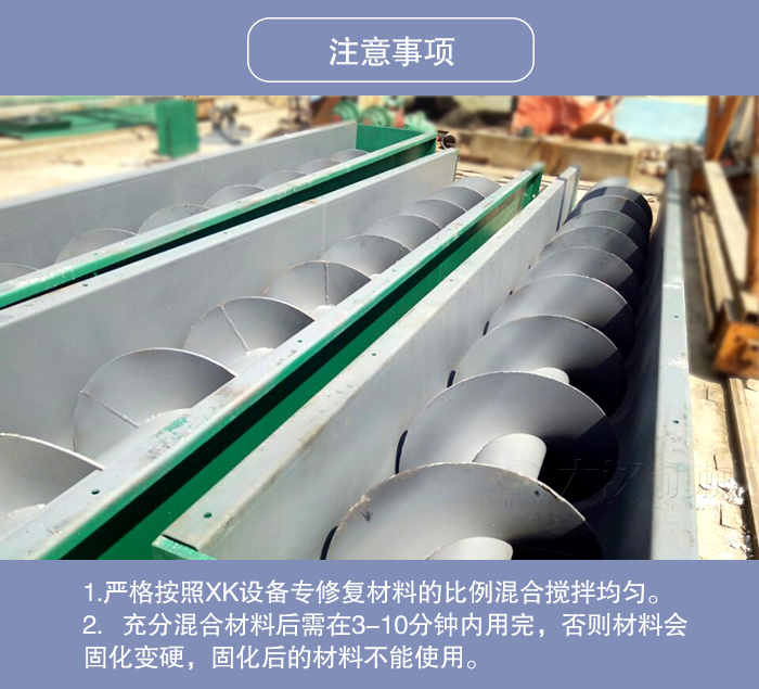 1.嚴格按照XK設備專修復材料的比例混合攪拌均勻。攪拌不均勻會出現局部不耐磨情況。