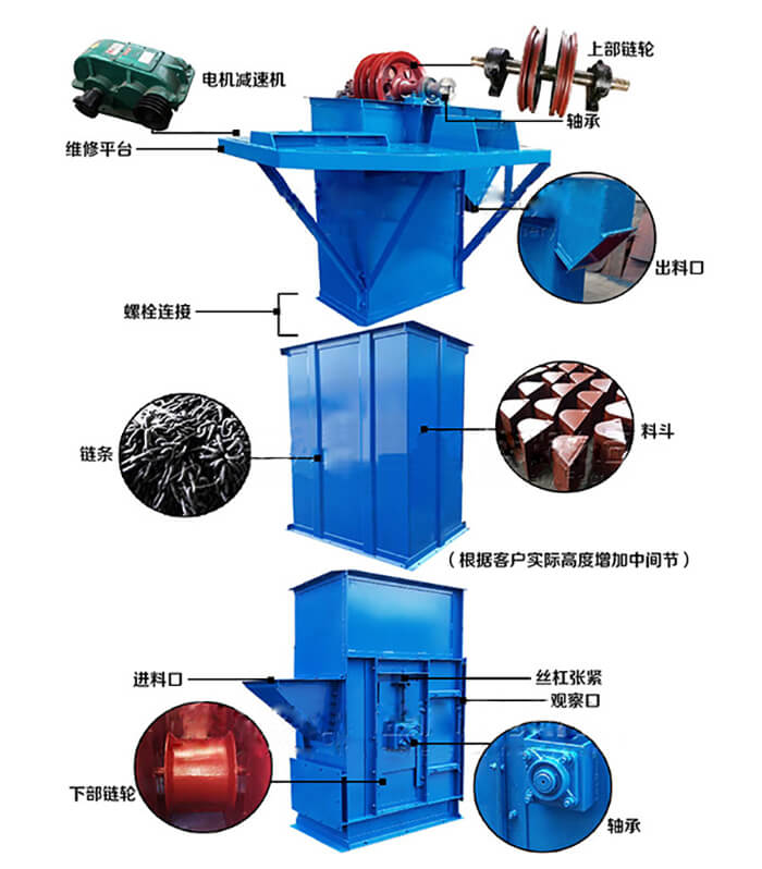 垂直斗式提升機是利用傳動首尾相接的牽引帶,帶動多個小斗運動,從低處向高處輸送物料的設(shè)備。