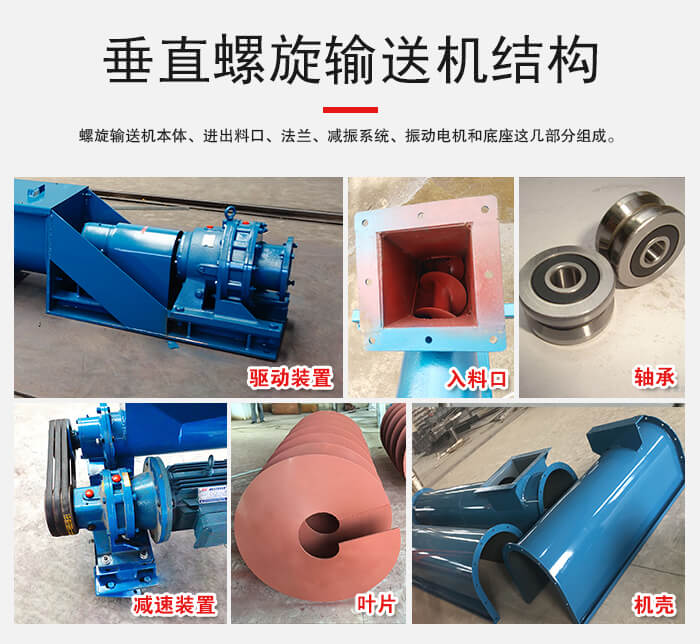 垂直螺旋輸送機螺旋輸送機本體、進(jìn)出料口、法蘭、減振系統(tǒng)、振動電機和底座這幾部分組成。