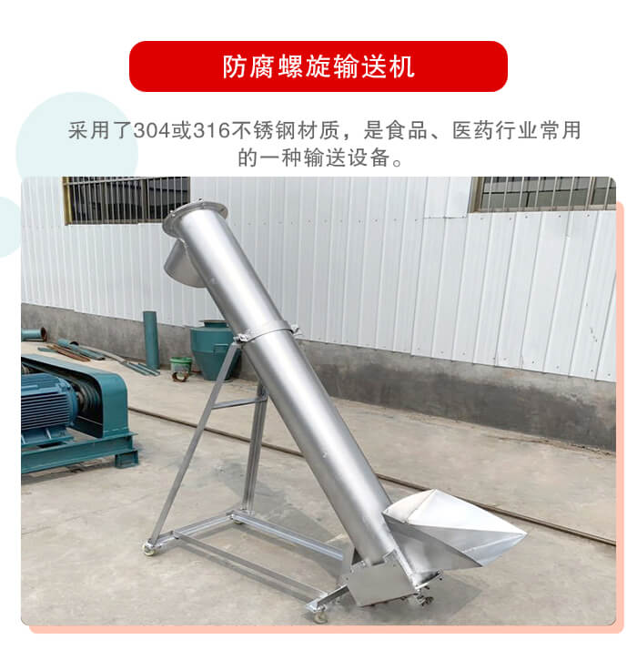 防腐螺旋輸送機采用了304或316不銹鋼材質(zhì),是食品、醫(yī)藥行業(yè)常用的一種輸送設備,今天小編就來為大家介紹一下防腐螺旋輸送機的特點及適用范圍:
