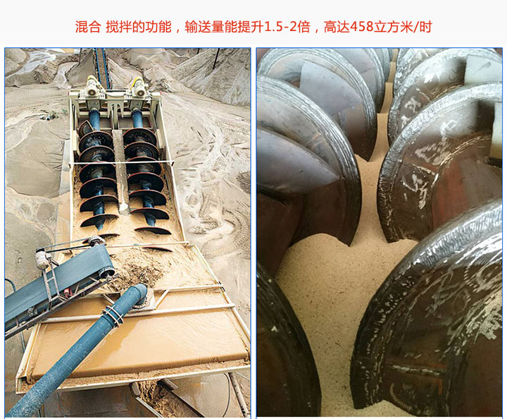 雙軸螺旋輸送機是兩片螺旋葉片組合而成,兩根螺旋軸相反方向旋轉,具備混合、攪拌的功能,輸送量能提升1.5-2倍,高達458立方米/時。