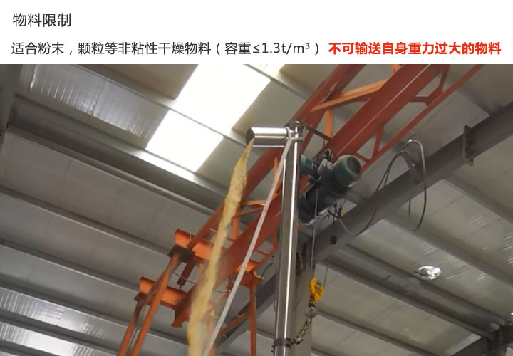 垂直螺旋輸送機(jī)只用于輸送粉末或固體顆粒等非粘性干燥物料(容重≤1.3t/m³),因?yàn)槠洳捎孟蛏陷斔停谳斔瓦^(guò)程中物料自身重力如果過(guò)重,會(huì)造成輸送難以進(jìn)行。