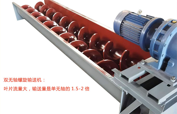 此外,想要輸送產量大選雙無軸螺旋輸送機,雙無軸設計,葉片流量大,輸送量是單無軸的1.5-2倍;